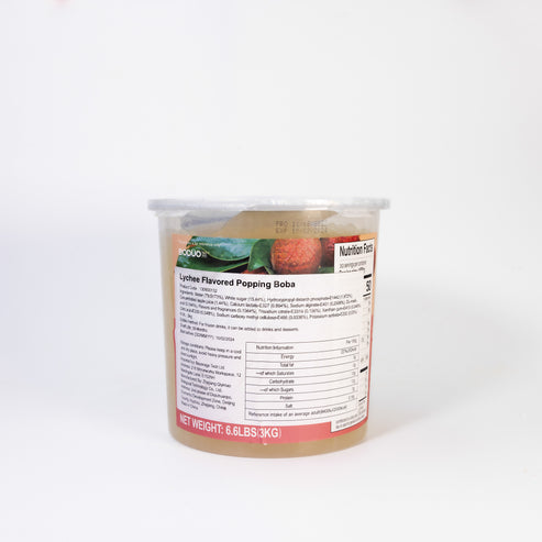 Tamam Supplies' lychee Bursting Boba, helps to create trendy bubble teas and other delicious beverages in the easiest of ways! This caffeine-free and vegetarian boba is made in traditional Taiwanese style, and filled with a deep, sweet, slightly tart blueberry flavour! Each boba is packed with 25% juice that bursts with a refreshing flavour when bitten into, giving a dynamic texture to your beverage or dessert. This versatile popping boba is commonly served with bubble tea or milk tea, and is also a great addition to smoothies and other refreshingly cold beverages! Additionally, display these bobas at your frozen yogurt bar, as a topping option for your trendy ice cream parlour, or get creative and add it to your brunch parfaits! ` Their vibrant colour and 10 mm diameter make for a visually appealing garnish to your recipes that customers will rave about. With its simple, ready-to-use characteristic, it is easy to add this boba to virtually any product; simply scoop, strain, and enjoy.